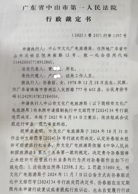 事件的起点本可归于平静。2024年2月,孙春丽接待香港6名同胞赴藏某,因客户临时退团引发退费争议,但她已及时与客户达成和解并退款70%(扣了某团已订票订餐住宿等30%已发生费用)。但这场早已和解的民事纠纷却成了行政权力介入的由头。2024年10月31日,中山某局作出中文综罚字〔2024〕34号《行政处罚决定书》,以“未经许可经营旅行社业务”为由,决定没收″违法所得″12598.2元(实际是旅行社收客户违约造成的损失款,孙春丽没有收)、并罚款55000元——近7万元的处罚,对独自支撑家庭的单亲母亲而言,无疑是沉重负担和打击。