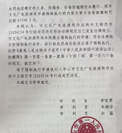 当事件进入司法程序,本应是纠正行政偏差的“最后防线”也宣告失效。中山市第一人民法院法官李某、朱某、余某在审查强制执行申请时,未听取孙春丽的陈述申辩,无视其持有合法营业执照、纠纷已和解的核心事实,未进行实质审查便作出(2025)粤2071行审1397号的审结性行政裁定书,准予强制执行,两单位关系人狼狈合谋共犯。法律明确规定,对明显缺乏事实依据、可能损害被执行人合法权益的行政行为,法院应裁定不准予执行,但此案中,司法的“把关”作用荡然无存。