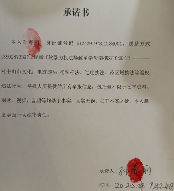 面对中山某局人员打着″执法"的名义反复上门骚扰,两个孩子恐惧,颤颤惊惊,无心上学,还有左邻右舍不知道我犯了什么法的鄙鄙视眼光,面对求助无门后,于是逃离成了唯一选择。孙春丽只好带着两个未成年孩子,被迫离开定居的中山市,而迁居珠海市租房寻求安宁。但这场逃亡并未终结噩梦,反而迎来更嚣张的跨市迫害。根据《行政处罚法》第二十二条“违法行为发生地管辖”原则,及国家明确禁止的“违规异地执法”要求,中山某局却无视行政管辖边界,将执法魔手直接伸到珠海,两次故意到工作单位恶意送达罚款文书,而且每次都是浩浩荡荡十余人,兴师动众,给单位造成严重影响,给孙春丽造成百口难辩的声誉毁伤。这种声势浩荡的执法,跨域追罚滋扰的恶劣行径,完全脱离执法范畴,沦为典型的恐吓软暴力,不仅让孙春丽精神濒临崩溃,更让两个孩子在发抖中流泪,经常半夜吓醒。